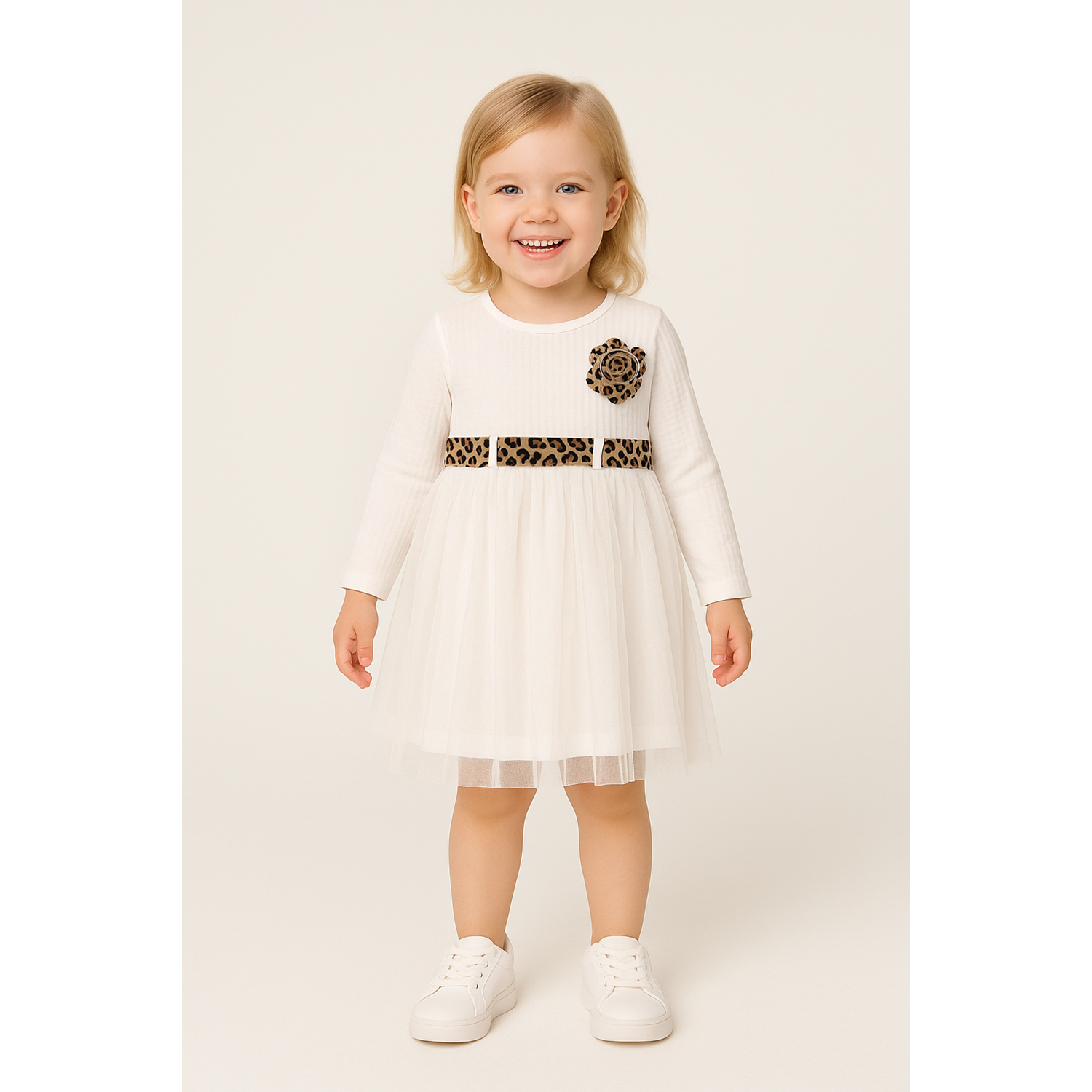 Kız Çocuk Elbise Leopar Kemerli - Krem - (98/122)