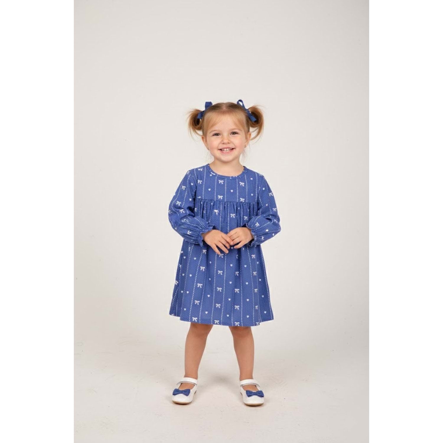 Kız Çocuk Fiyonk Baskılı Elbise - Kot Rengi - (92/116)
